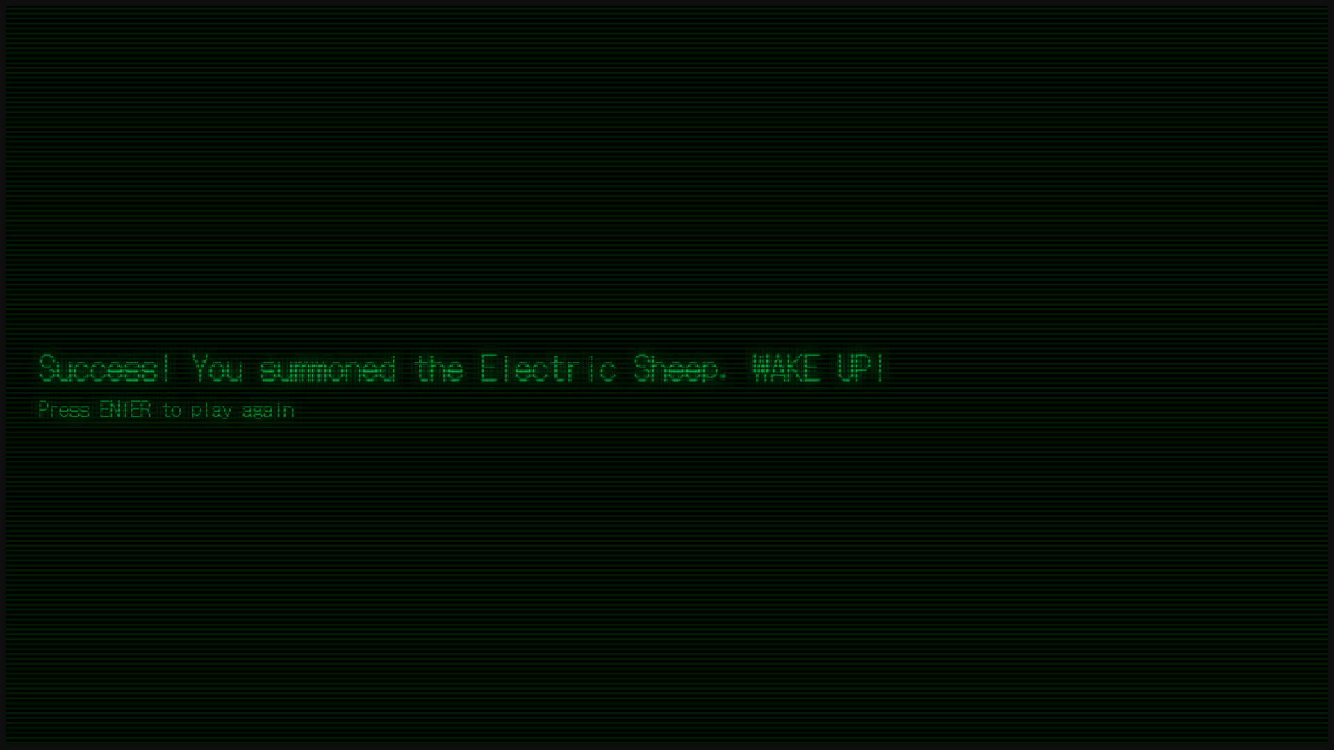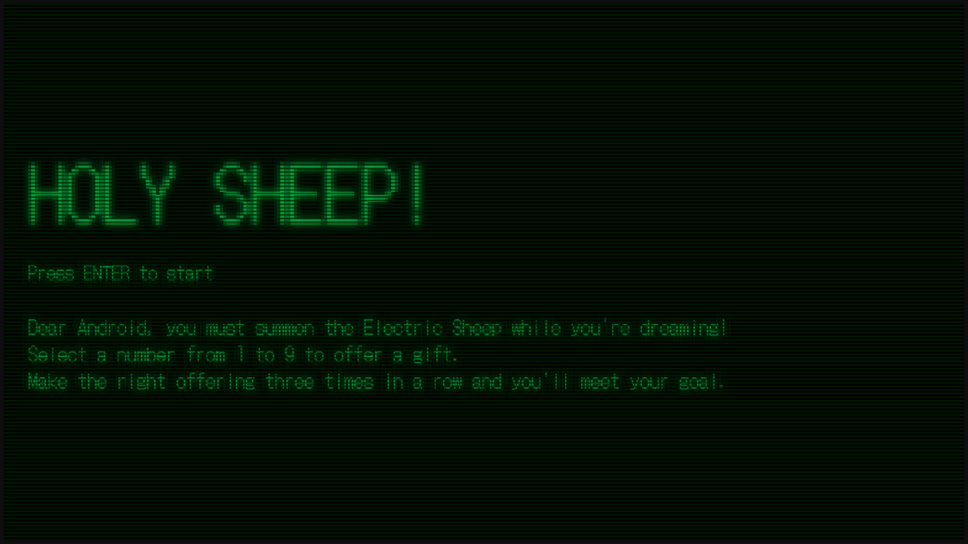 After days of hard work, you're now a sleepy android. In order to break the sleep cycle and get back to your duties, you must summon the Electric Sheep in your dreams. Each riddle you see is a request from the Sheep, so use numbers from 1 to 9 to make your offerings. Having an offering accepted three times in a row will wake you up.